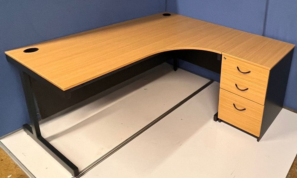 1600mm Right Hand Curved Desk with 3 Drawer Desk High Pedestal Oak (used)